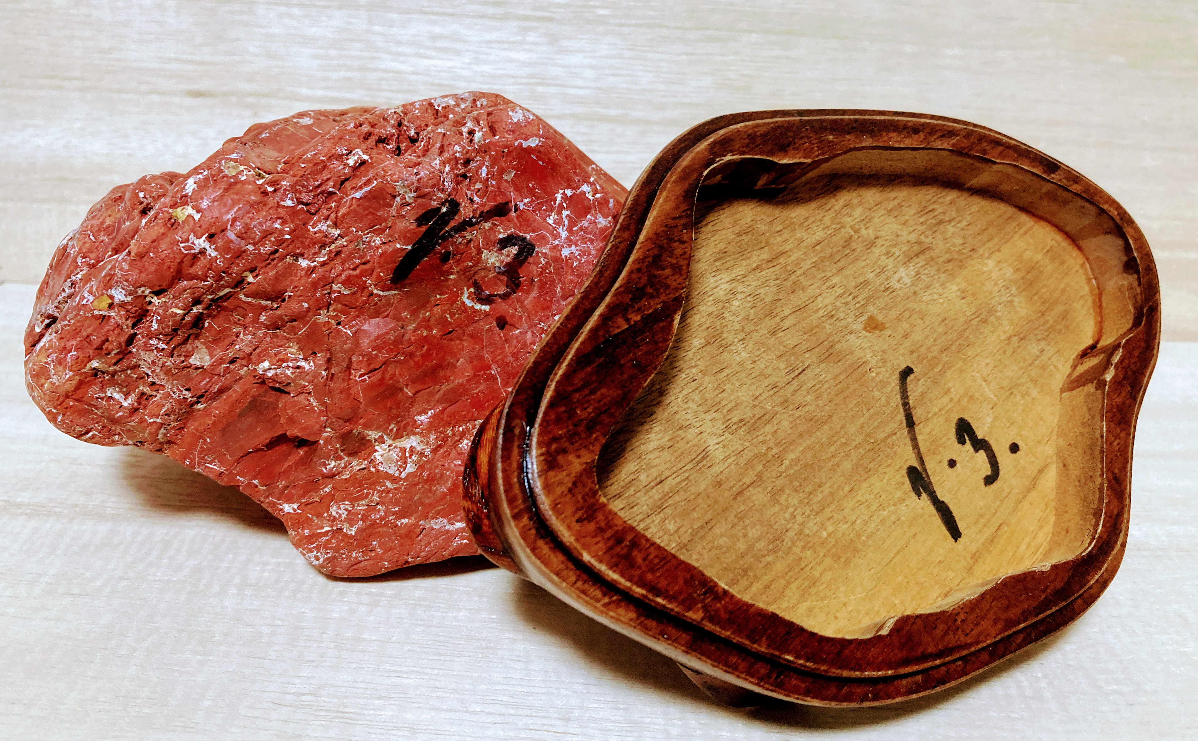 We must not forget the quality and beauty of the stone. Akadama-ishi is a dense collection of tiny quartz particles that contain iron oxide as an impurity, and is said to be iron quartz. Because it is a collection of tiny particles, it may have cavities and cracks in places, but because it is quartz, it is very hard. In this respect, mineralogically it is the same as jasper, which is made up of tiny quartz crystals. However, perhaps due to the influence of hydrothermal water during its formation, Akadama has a slightly different appearance compared to jasper from other regions. For example, it appears harder and sharper than the Nishiki-ishi found in the Tsugaru region of Aomori Prefecture.